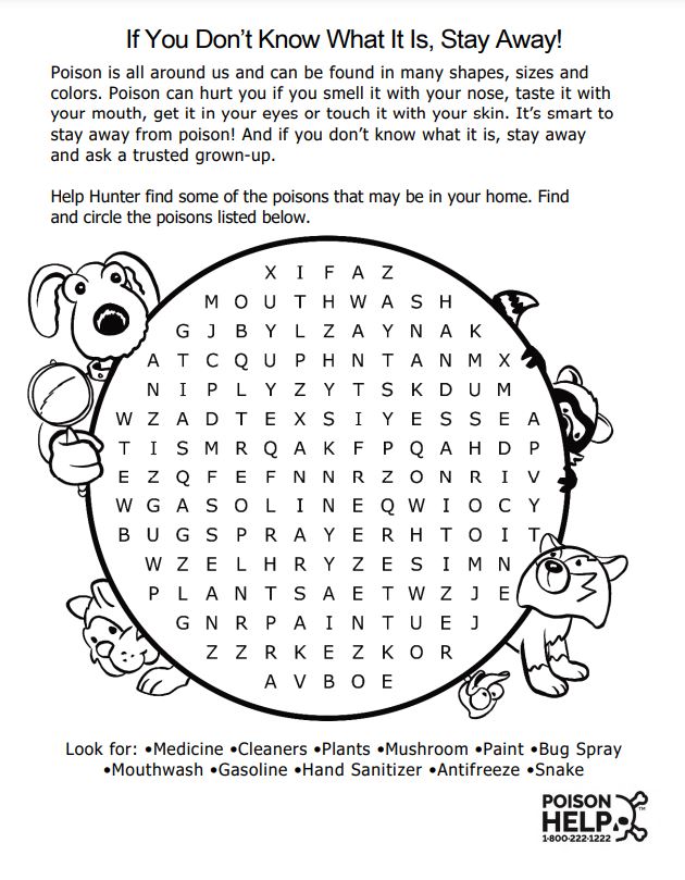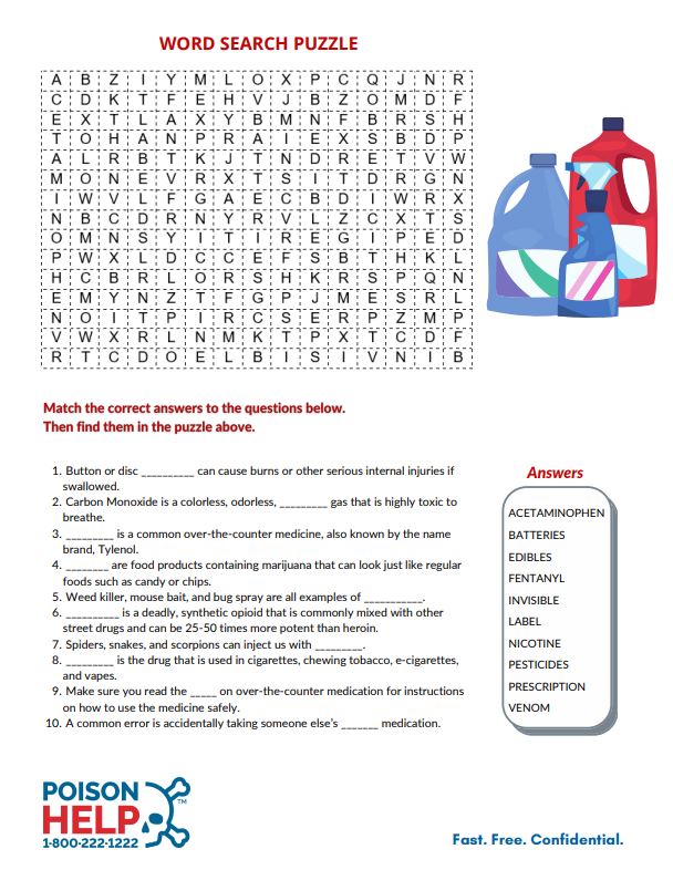 Poisons can be hiding all around the house.  Can you find the poisons hiding in the word search?